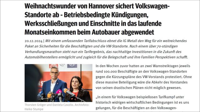 Der Abschluss bei Volkswagen ist beispiellos. Mehr als jeder vierte Arbeitsplatz, insgesamt 35.000, werden vernichtet, das entspricht drei größeren Werken. Die Löhne werden real um bis zu 18 Prozent gesenkt.